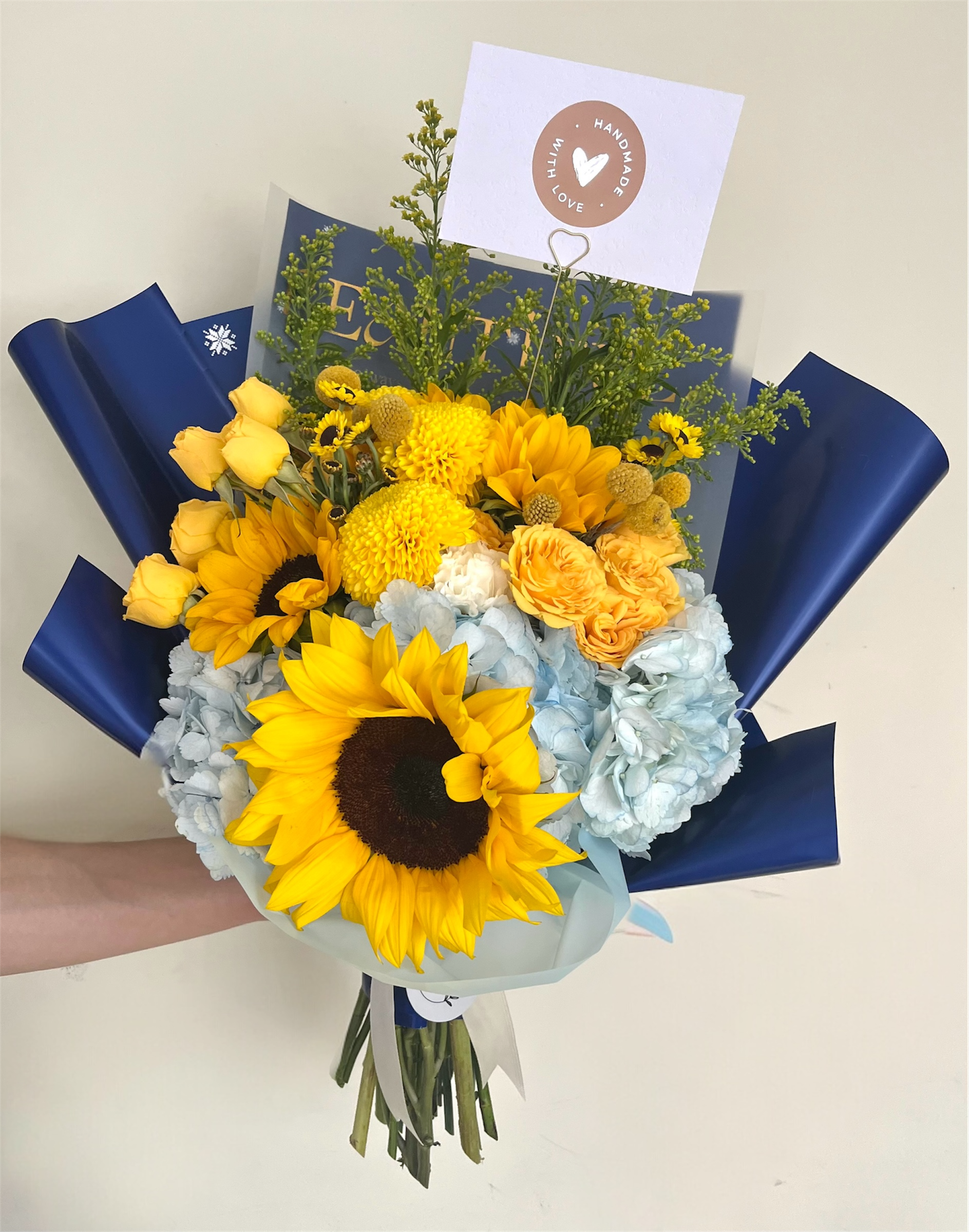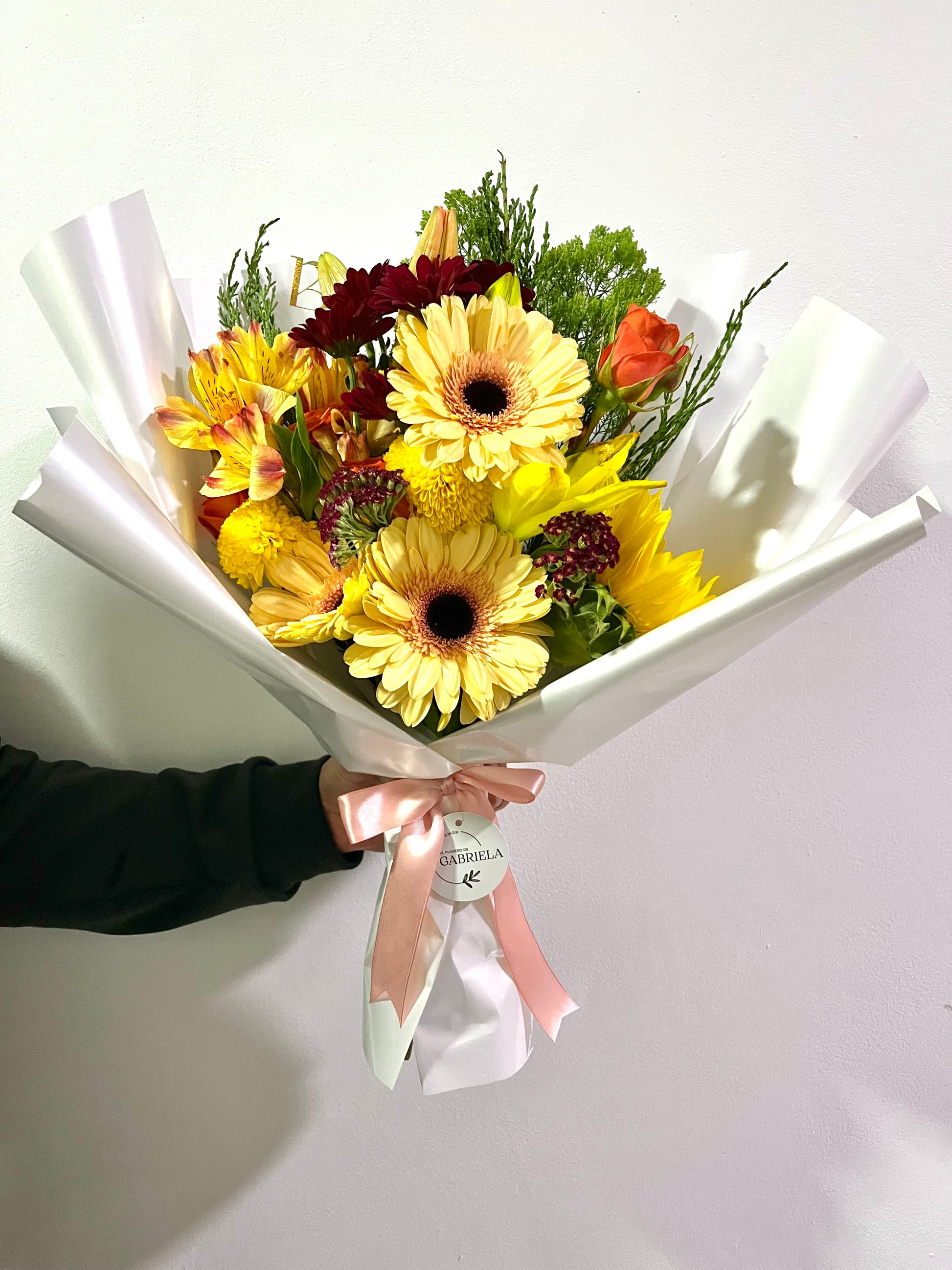 La intensidad del sol capturada en un ramo. Este diseño Garden resalta por sus colores vibrantes: naranjas encendidos y amarillos brillantes que aportan energía inmediata a cualquier espacio. Ideal para celebrar éxitos, cumpleaños o simplemente para iluminar el día de alguien especial con alegría pura.